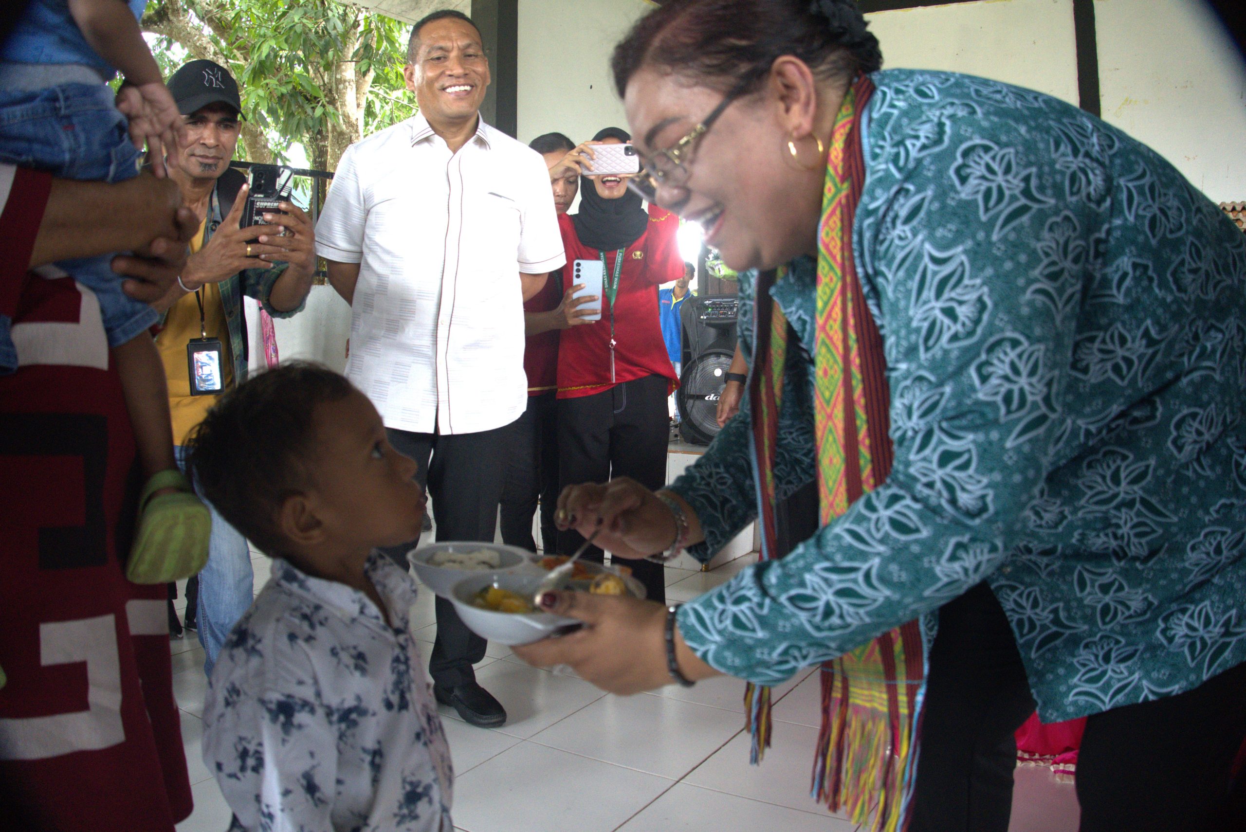 Pj Ketua Tim Penggerak PKK Kabupaten Maluku Tenggara (Malra), Keterina L. Lappy Huwae, memberikan Makanan Tambahan bagi salah satu Balita di Ohoi Wain, Kecamatan Kei Kecil Timur, Jumat (24/1/2025).