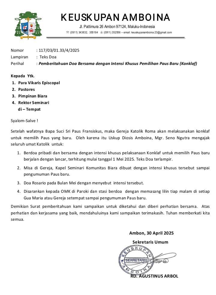Berikut petikan surat pemberitahuan dari Keuskupan Amboina :