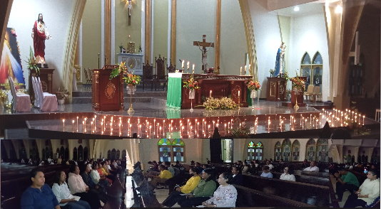 Ratusan lilin pun dipasang di depan pintu masuk Gereja dan pelataran altar.