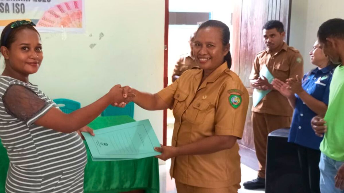 Kepala Seksi Pemerintahan Kantor Kecamatan Kei Kecil Timur, Yohana Welikin, S. Sos., menyerahkan SK Kepala Ohoi Iso kepada unsur Aparatur Kelembagaan, Senin (19/1/2026).