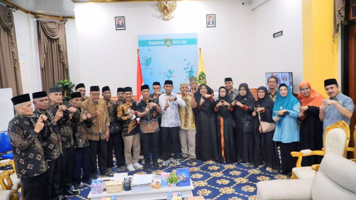 Tual, LanggurNews.com – Wali Kota Tual, Akhmad Yani Renuat, bersama Wakilnya Amir Rumra, melepas secara resmi 14 jemaah Umroh di Ruang Kerja Wali Kota Tual, Jumat (3/10/2025).